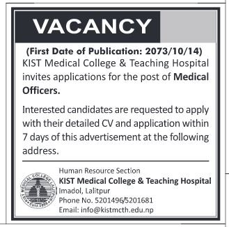 There is vacancy for the medical officers at KIST medical college and teaching hospital imadol lalitpur