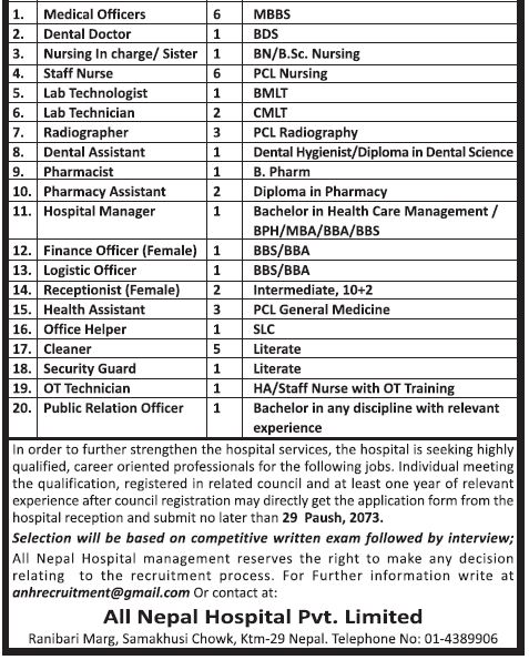 Hospital Manager(BPH), Medical Officers (6), Dental Doctor (1), Nursing Incharge (1), Staff Nurse (6), Lab Tech (3), Dental Hygienist (1) , Pharmacist (1) Pharmacy Assistant (2), Health Assistant (3), OT Technician (1) & Radiographer (3) – All Nepal Hospital (29th Poush 2073)